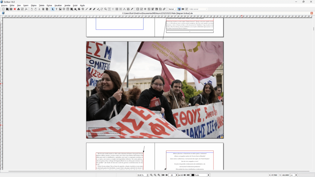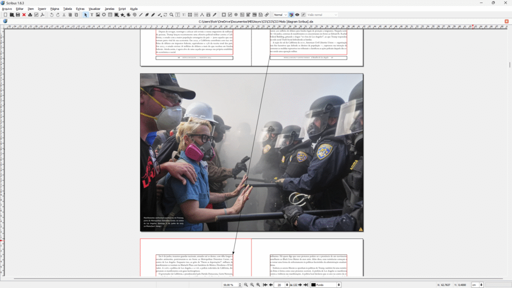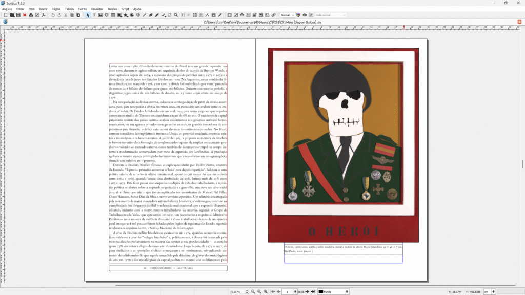 Interface do Scribus, versão 1.6.3, com arquivo em processo de diagramação do número 2 da Crítica Socialista. Aqui, utilizei toda a página para a imagem, além de ter inserido a legenda dentro da imagem.