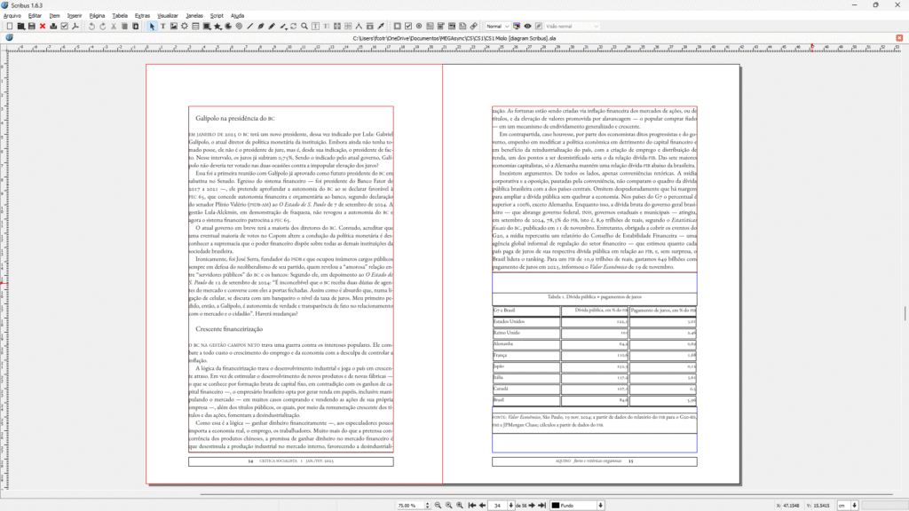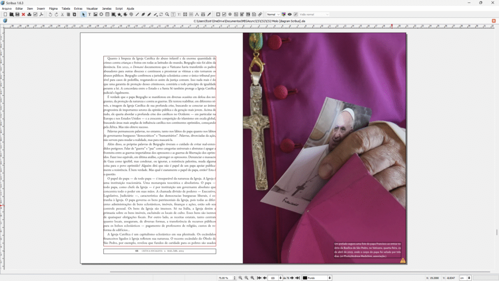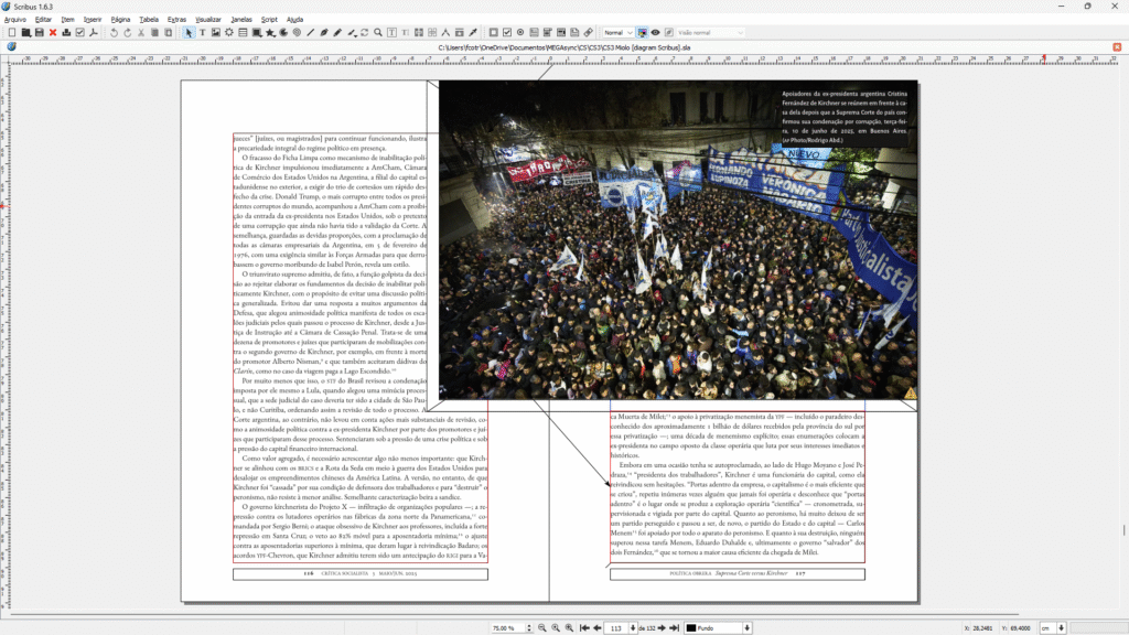 Interface do Scribus, versão 1.6.3, com arquivo em processo de diagramação do número 3 da Crítica Socialista, com imagens que “invadem” o texto e que “quebram” a página vizinha.