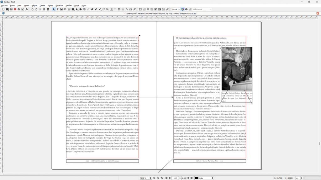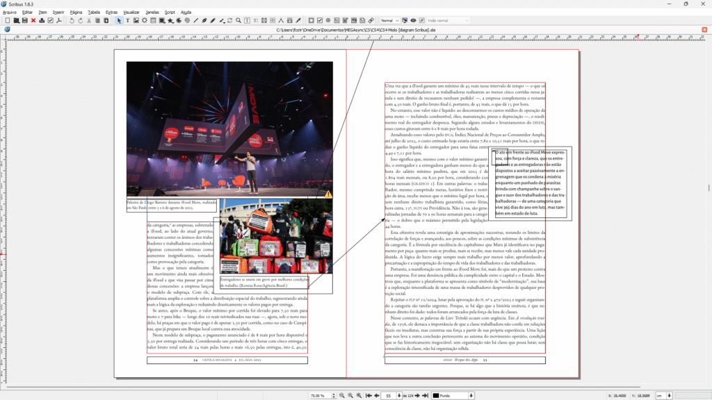 Interface do Scribus, versão 1.6.3, com arquivo em processo de diagramação do número 3 da Crítica Socialista. Note a seta que atravessa a imagem, indicando a conexão entre os blocos de texto, que “saltam” duas páginas. Diferentemente dos editores de texto, o conteúdo em softwares de diagramação não é um continuo, mas permitem-se “saltos”. Isto é, um texto na página 15 pode saltar para a página 20. E as páginas 16 a 19 podem apresentar outro conteúdo, como anúncios, iconografia etc.